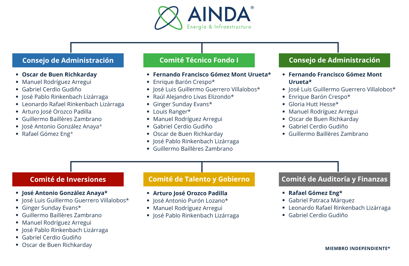 AINDA cuenta con miembros independientes de clase mundial en sus órganos de gobierno los cuales permiten llevar a cabo un análisis y toma de decisiones objetivo en las inversiones potenciales, así como monitorear y tomar decisiones respecto a la administración.